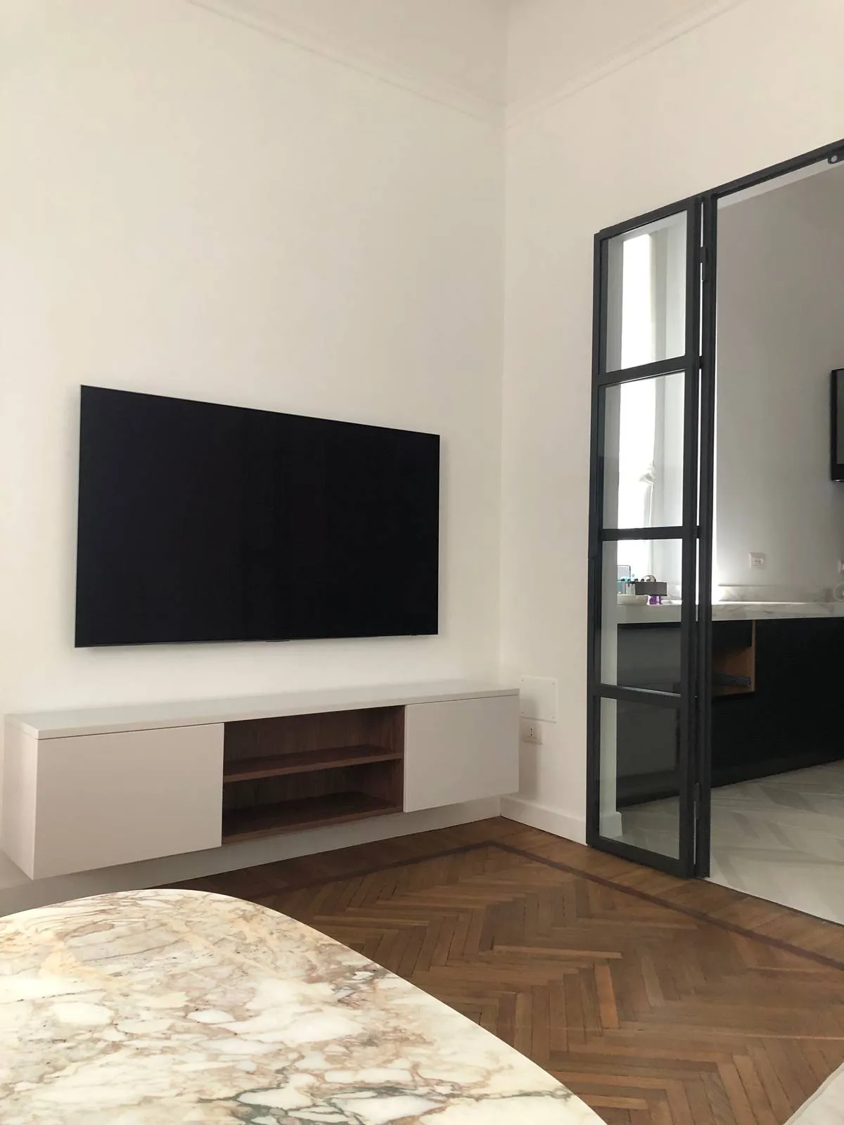In questo caso per collegare un salotto alla sala da pranzo è stata realizzata un’apertura con un grande portale. I due parquet presenti nei due locali, entrambi posati con la tradizionale spina di pesce, sono stati raccordati con una fascia a pettine, che crea un cambio di direzione e confonde un po’ l’occhio su eventuali imperfezioni. Poi entrambi i parquet sono stati  lamati e verniciati con vernice all’acqua opaca per evitare differenze di colore e renderli perfettamente protetti senza snaturarli.