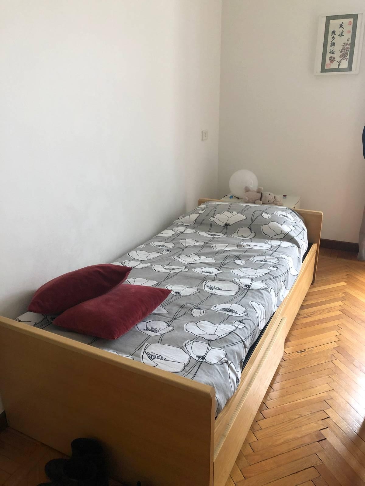 Si è poi passati al montaggio dei nuovi mobili. Invece del letto singolo c’è un letto a una piazza e mezza, posizionato nello stesso angolo. Avendo ampliato il letto, non c’è più spazio per il comodino; così è stato fatto realizzare dal mobiliere un pensile a giorno, laccato color bianco, che come una sorta di mensola ha funzione d’appoggio.