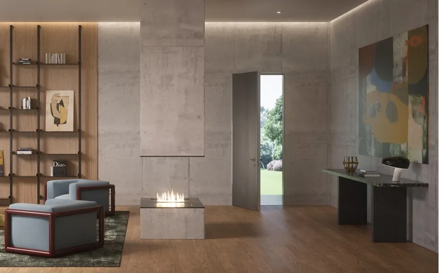 La cerniera permette la posa rasomuro della porta che, sul lato interno, può nascondere il telaio per far risaltare la porta come elemento d’arredo o, al contrario, integrarla in maniera complanare alla finitura e al colore della parete.