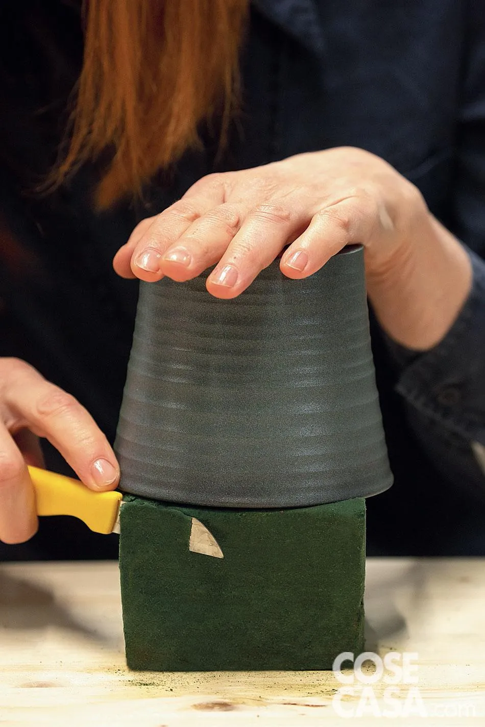 Aiutandosi con il coltellino, ricavare dalla spugna un blocco con i lati di circa 8 cm. Appoggiarlo nel contenitore riempito d’acqua e lasciarlo inzuppare senza fare pressione: quando la spugna si sarà completamente depositata sul fondo sarà pronta. Poi estrarla, farla scolare leggermente e, aiutandosi con il vaso rotondo, tagliare gli angoli per sagomarla, fino a ottenere un cilindro.