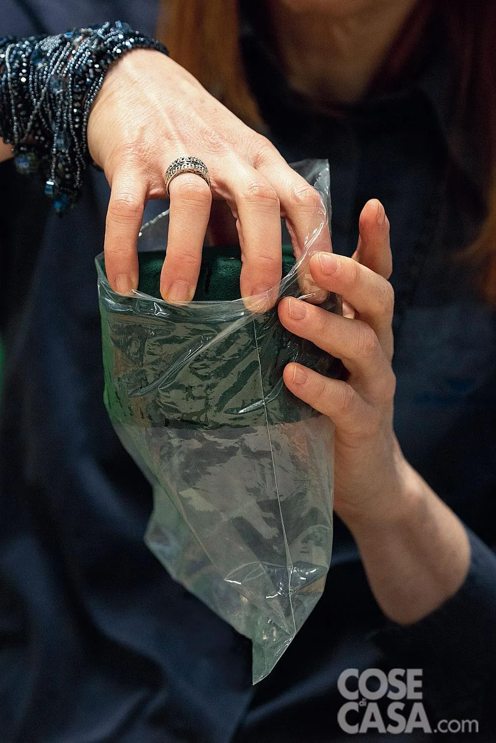Introdurre la spugna nel sacchetto di plastica e ripiegare verso il basso la parte in eccedenza.