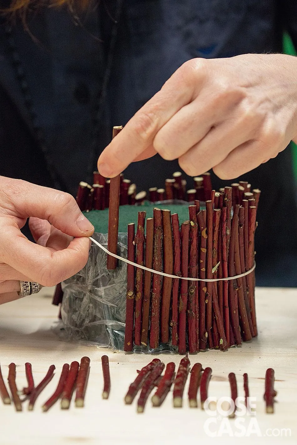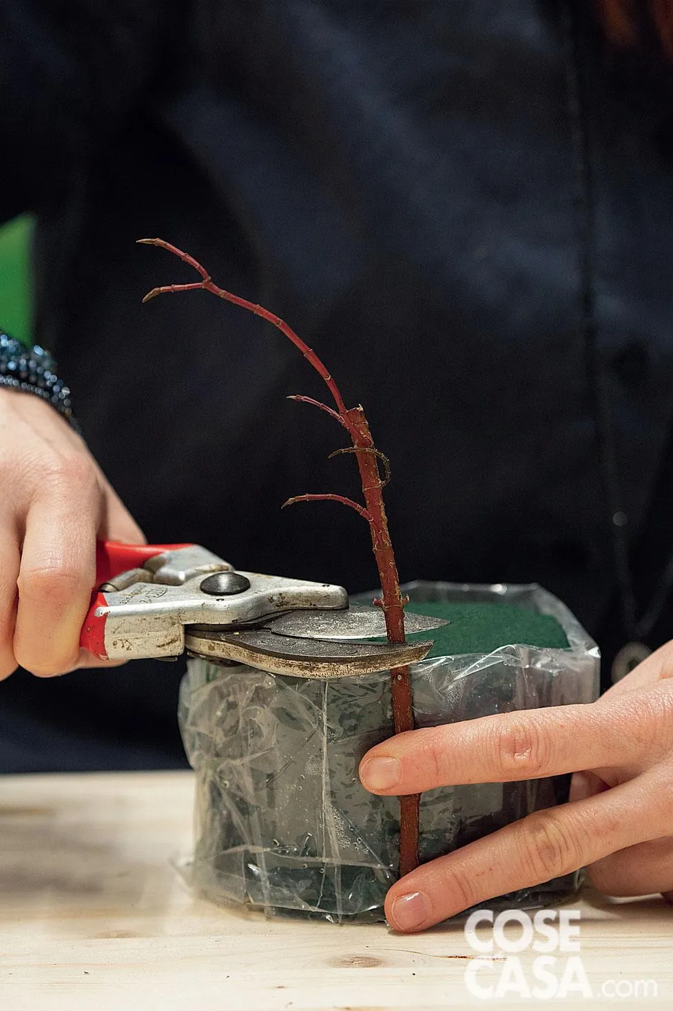 Posizionare un rametto di cornus davanti alla spugna e tagliarlo, utilizzando le cesoie, circa 1 o 2 cm sopra l’altezza della spugna. Tagliare anche tutti gli altri rametti alla stessa altezza del primo (qualche millimetro di differenza tra l’uno e l’altro può regalare un effetto più gradevole).