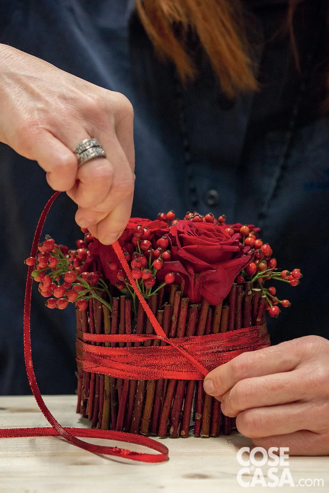 Per cambiare l’aspetto alla composizione, si possono sostituire le rose con dei ranuncoli di colore rosso, come ‘Passion’: hanno una corolla grande quanto quella delle rose e una buona durata. Il nastrino rosso serve per dare un tocco di freschezza alla composizione; sostituendolo con un nastro di velluto bordeaux alto 3 cm legato a fiocco si aggiunge una nota più formale ed elegante.