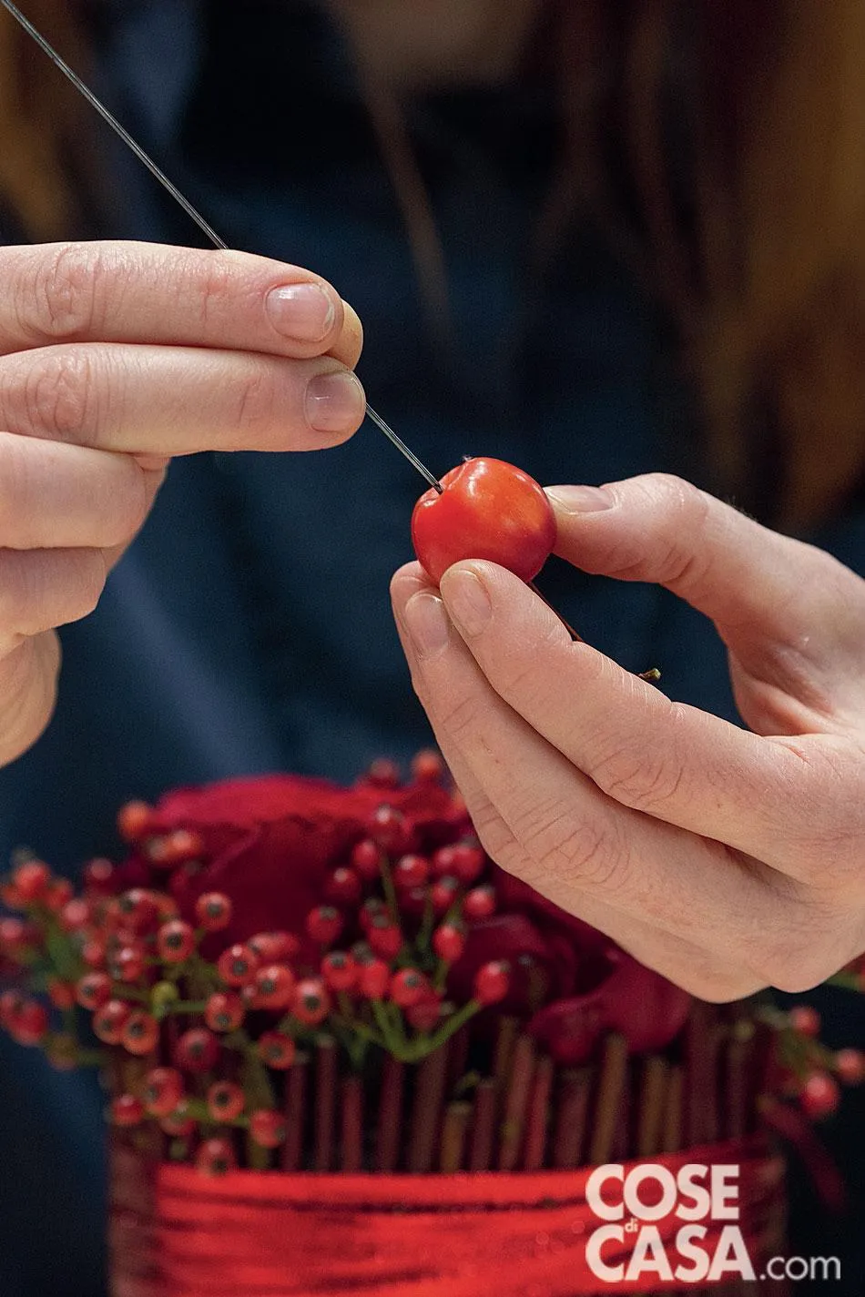 Inserire l’Ilex nella composizione, intervallandolo ai fiori e alle foglie. A questo punto prendere il barattolo, allontanarlo da sé e farlo ruotare per verificare che ci sia una buona distribuzione di fiori, bacche e foglie e non ci siano vuoti, e che il peso ottico dei vari elementi sia calibrato.